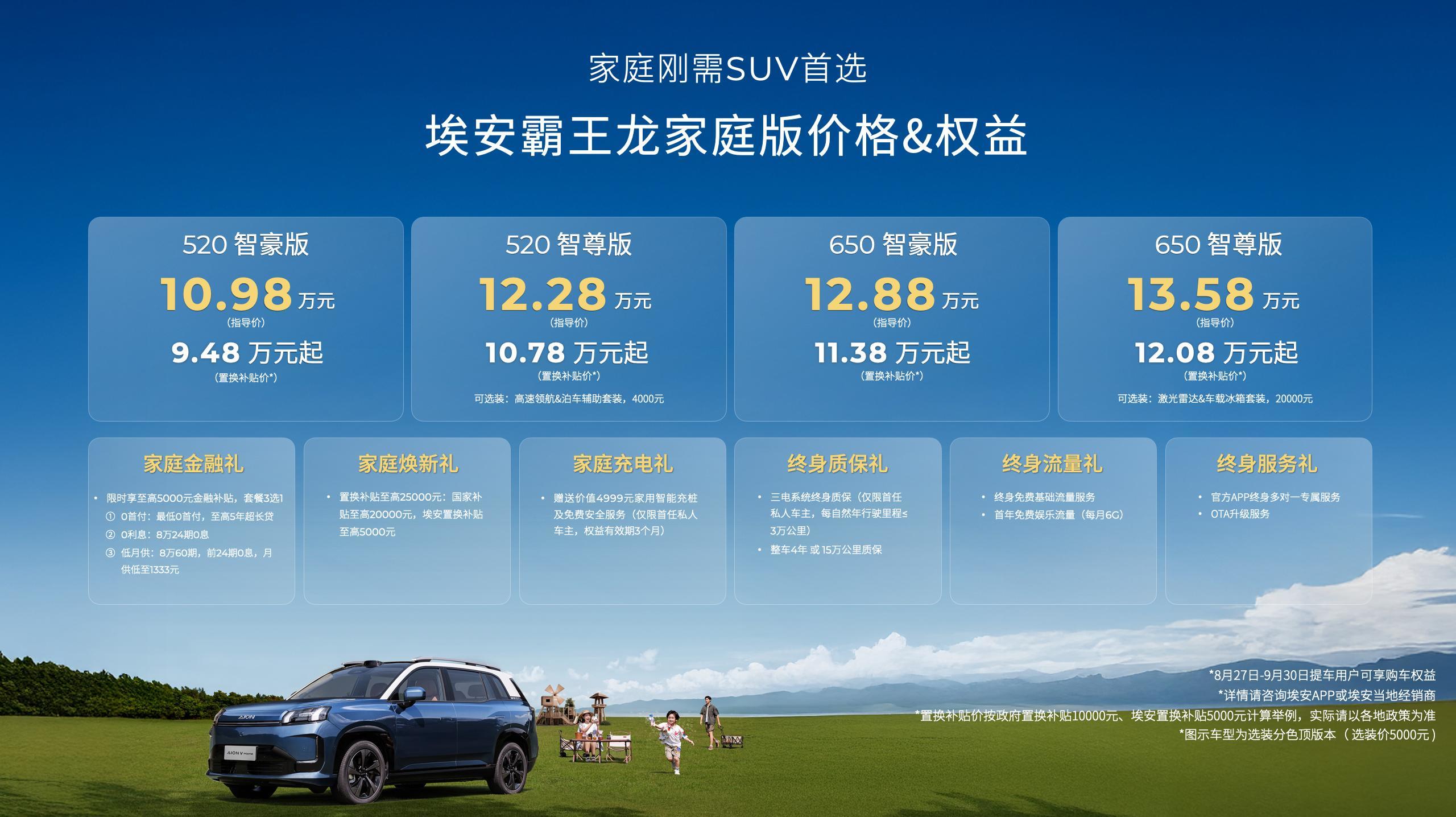 8月27日,埃安霸王龙家庭版 AION V Home正式上市,售价10.98-13.58万元起(置换补贴后,9.48万元起)。新车从家庭刚需用户的真实需求出发,带来五连杆后悬架等21项升级配置,拥有75度大电池等18项同级唯一配置,产品力越级提升。而对于持家有道、又对生活充满期待的家庭用户来说,埃安霸王龙家庭版既能满足全家多样化的出行需求,也没有让用户为不常用的冗余配置买单,以造新车的态度升级年款,为家庭刚需用户带来远超“刚好”的越级体验,成为A级纯电家用SUV的首选。